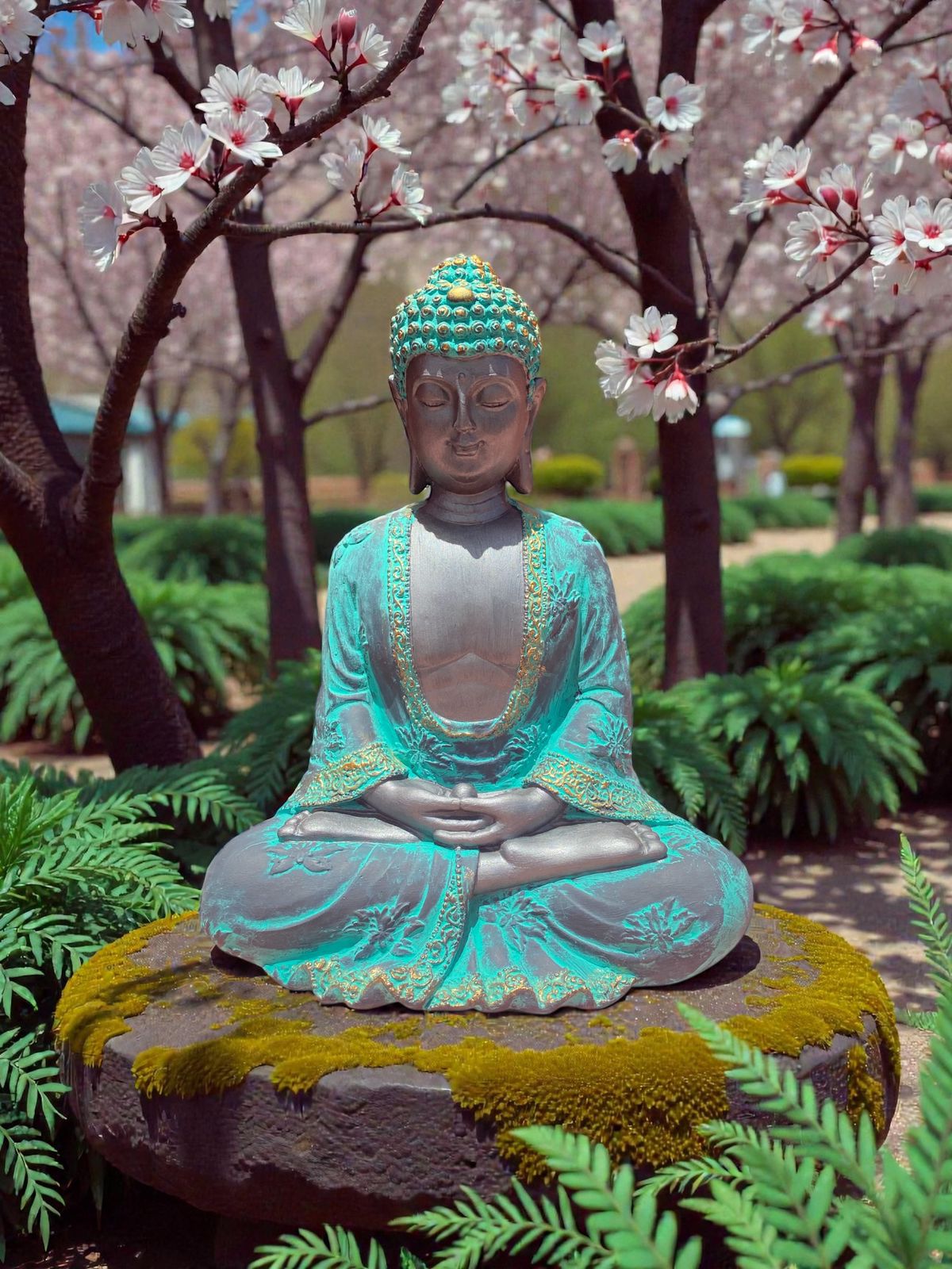 Essa imponente escultura de Buda em posição de meditação é mais do que uma peça decorativa: é um símbolo poderoso de serenidade, equilíbrio interior e iluminação espiritual. Com traços suaves e detalhes dourados sobre a túnica em tom verde turquesa, ela transmite paz e sofisticação ao ambiente.