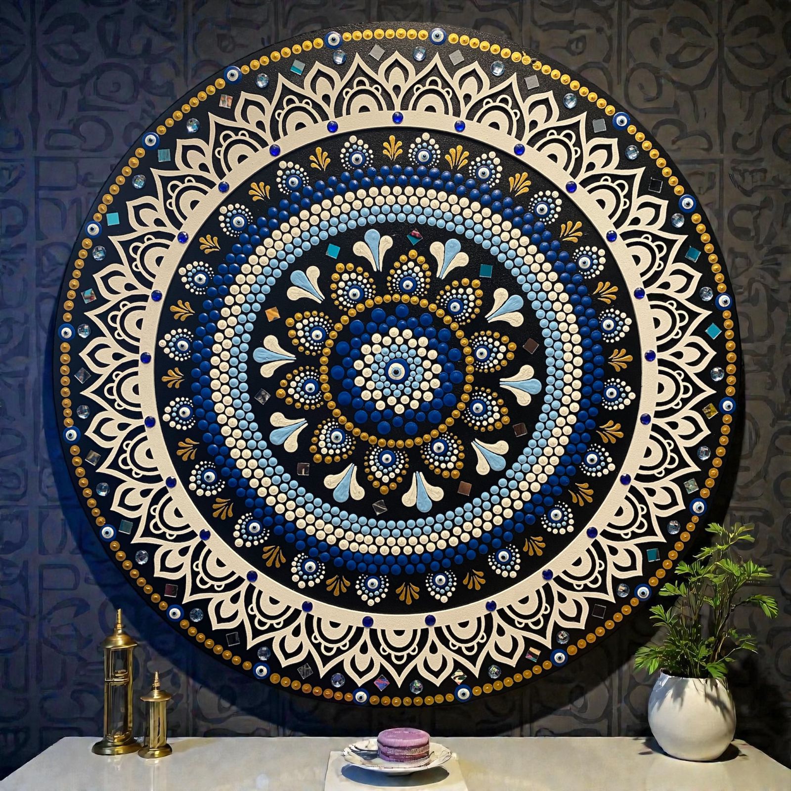 Essa mandala decorativa de 60 cm de diâmetro, feita em MDF de 6 mm, é uma peça única que une beleza, significado e proteção. Produzida com a técnica do pontilhismo, ela traz o olho grego como elemento central – um poderoso símbolo contra o mau-olhado e energias negativas. 🔵🧿